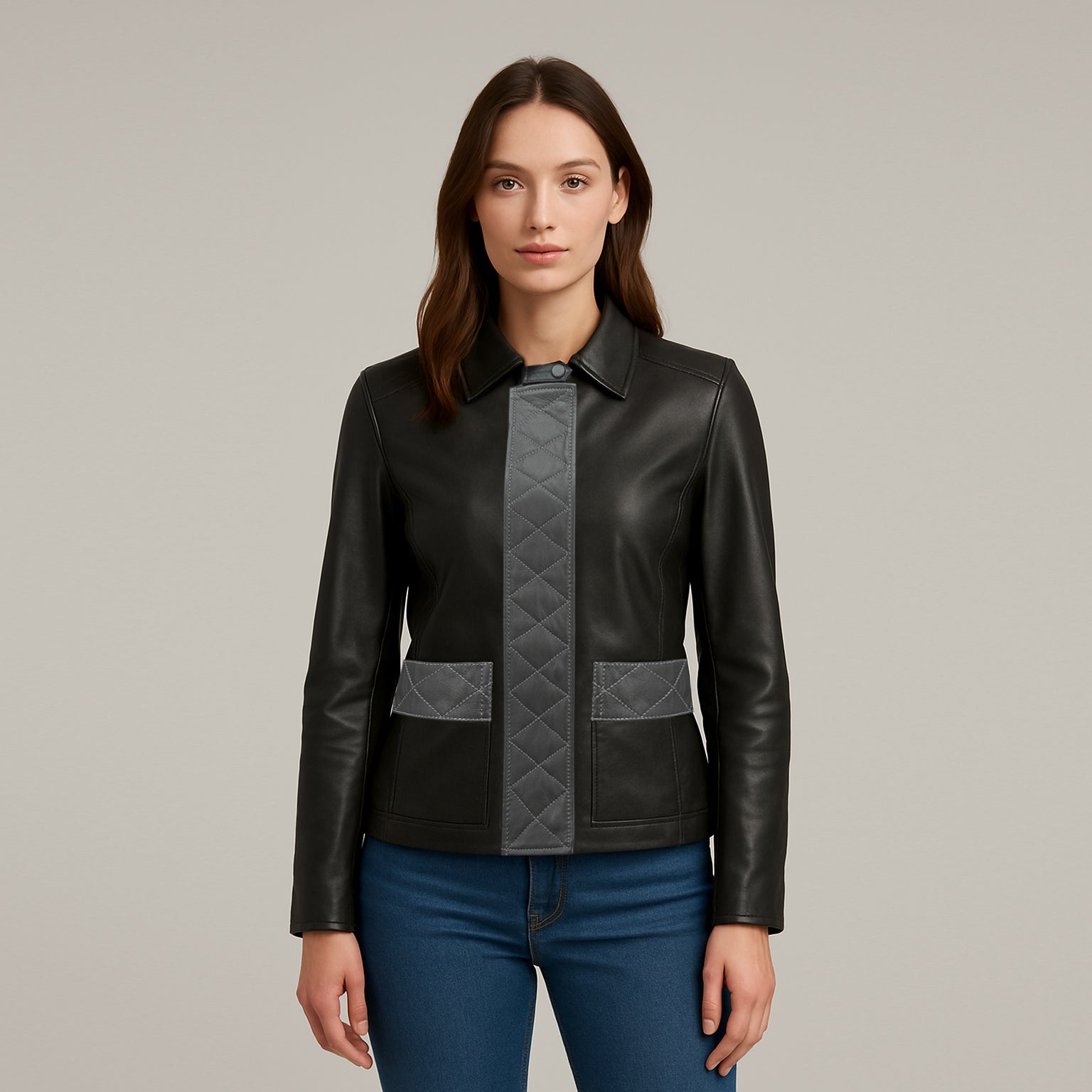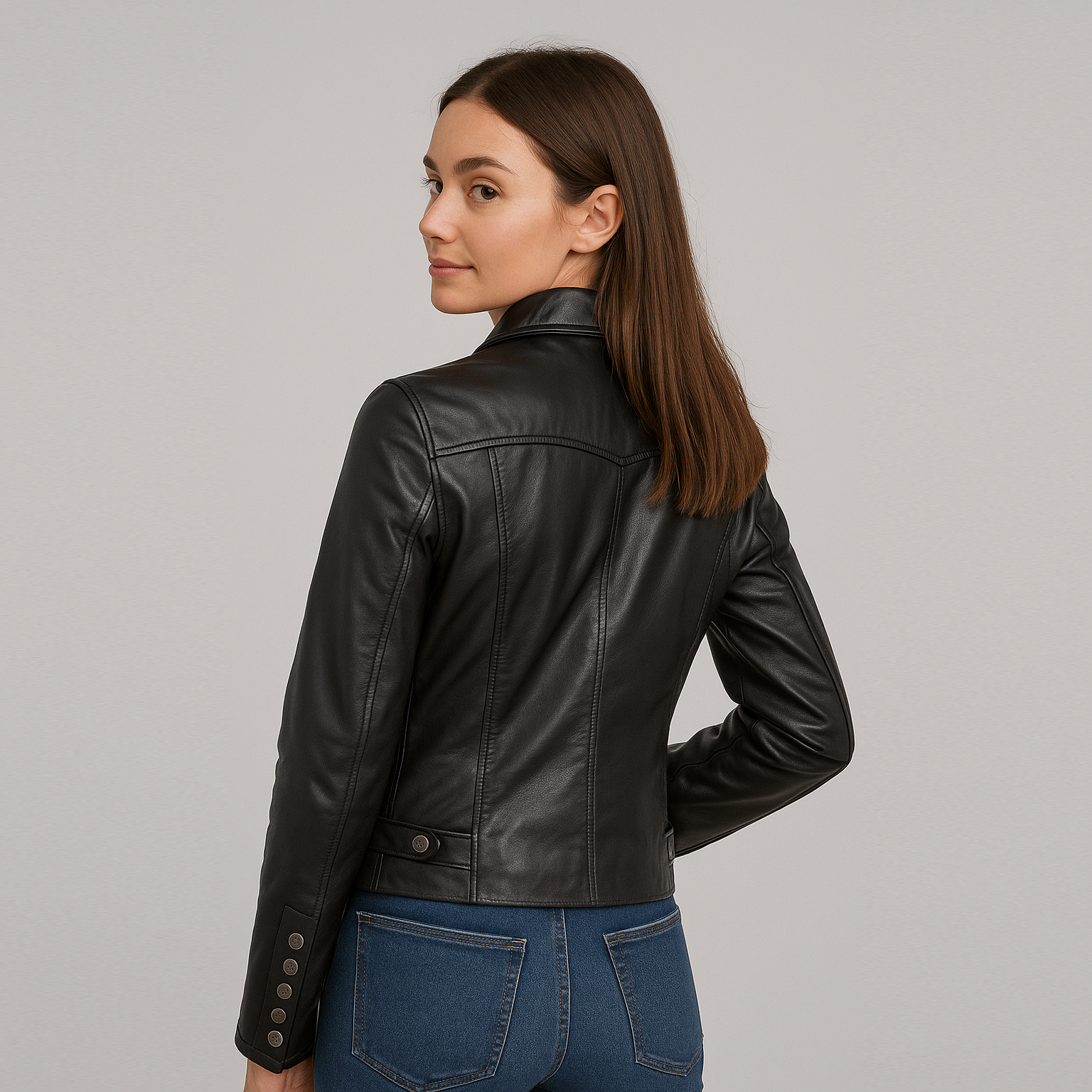 ⟶ Stylish Practical: Black women’s leather jacket combining fashion and functionality.
